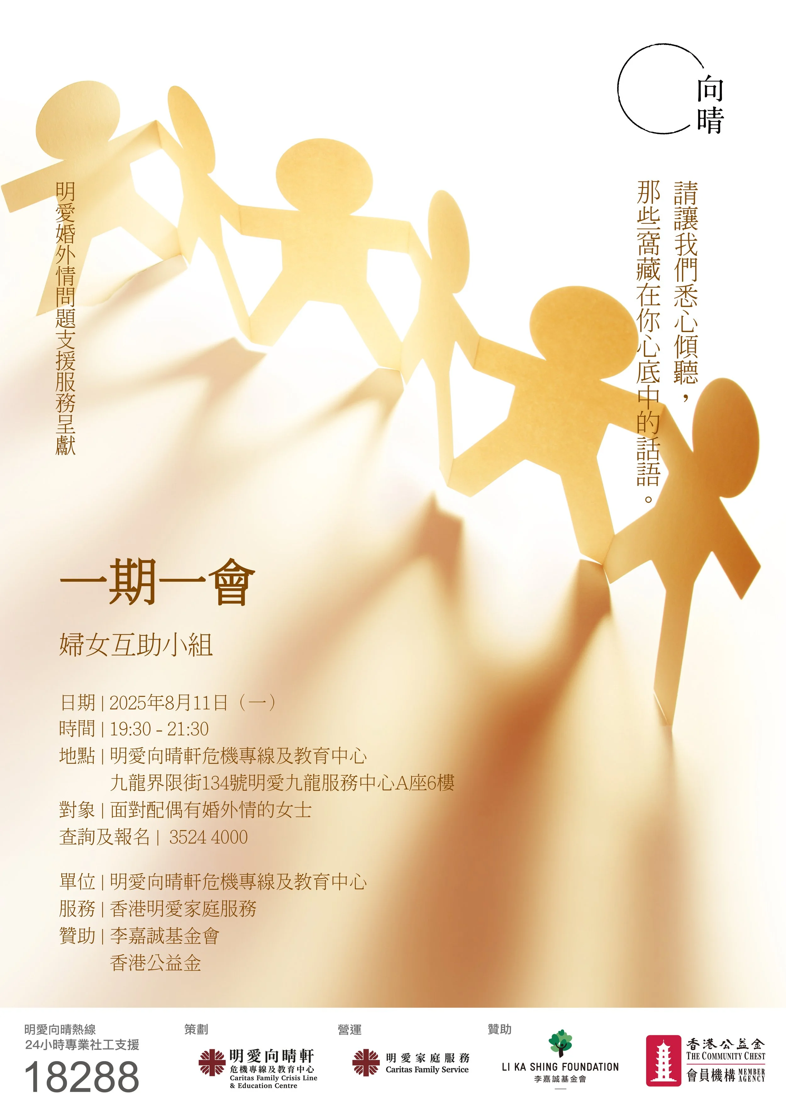為正受到伴侶婚外情問題困擾的人士,提供互助支援小組及朋輩電話關顧服務。